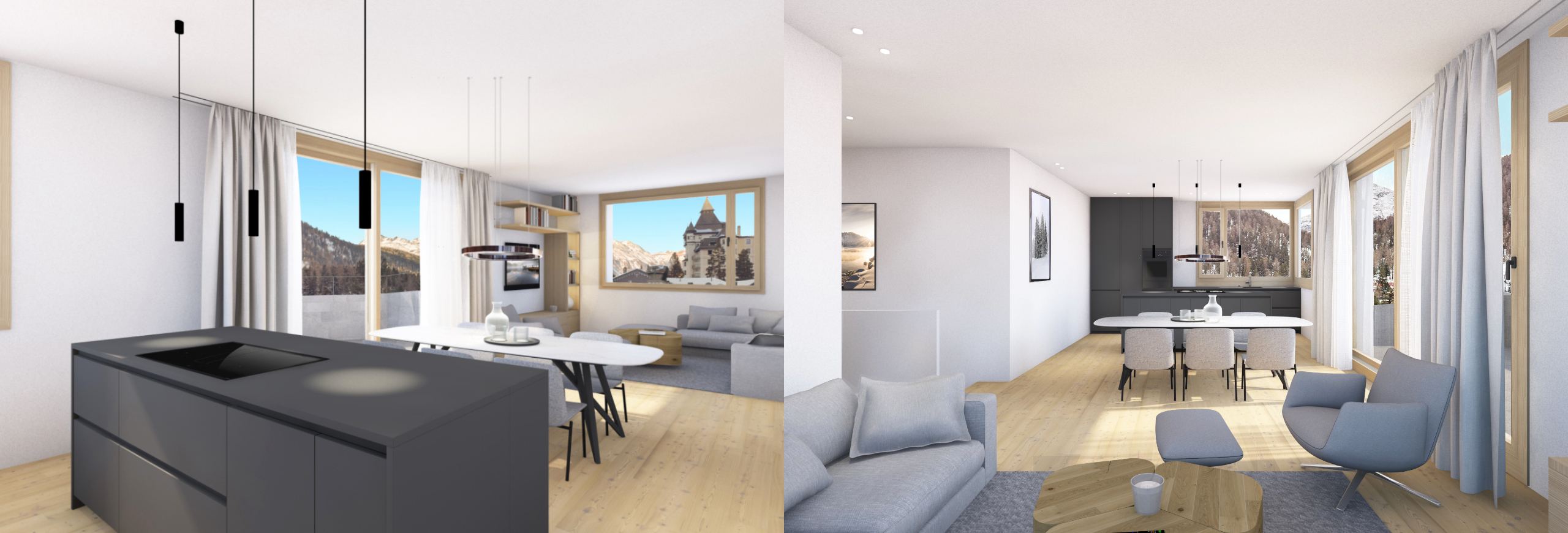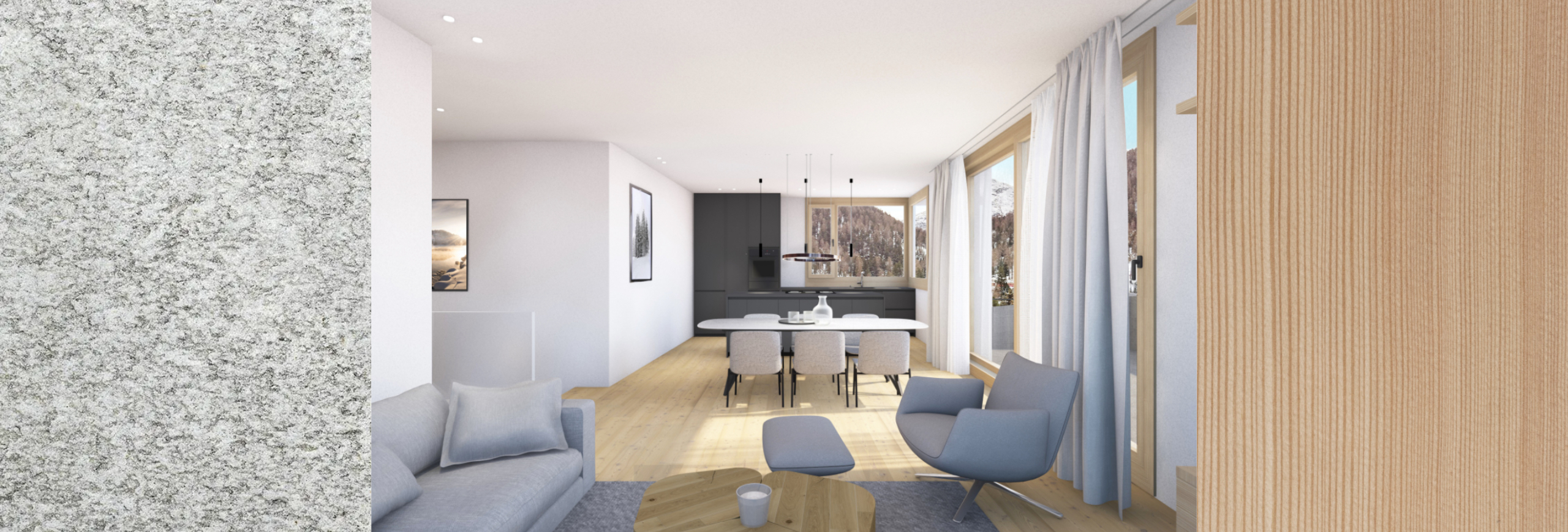 Die Innenraumgestaltung spiegelt die Verbundenheit mit der Engadiner Landschaft wider: warme Naturtöne, geöltes Lärchenholz aus heimischen Wäldern und edler Soglio-Granit schaffen eine harmonische Atmosphäre, die Ruhe und Beständigkeit ausstrahlt.